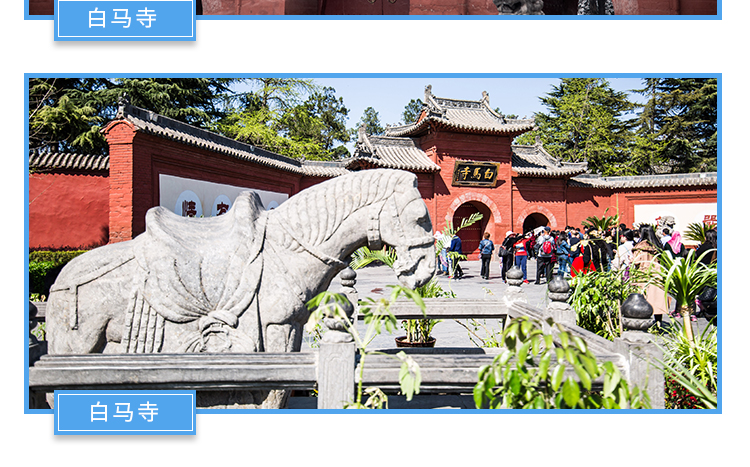 游览【白马寺】,是中国第一座皇家官办寺院,在佛教界被尊称为“释源“和“祖庭”。主要游览∶天王殿、大佛殿、大雄宝殿、接引殿、清凉台等中轴线上建筑。