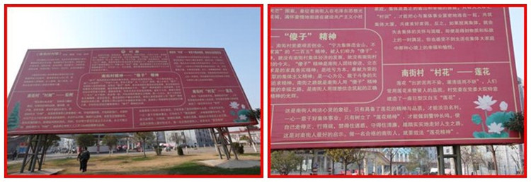 三是红廉楷模光荣榜。光荣榜正面是37名首批“三好建设者”的照片和其廉洁奋进的感人故事介绍,背面是南街村村徽、村花、村树、村训、村歌和南街村精神等内容。南街村以村花——“莲花”为主题,培养村民洁身自爱的廉洁基因;以村训——“傻子”精神为切入点,塑造村民先公后私的奉献精神。