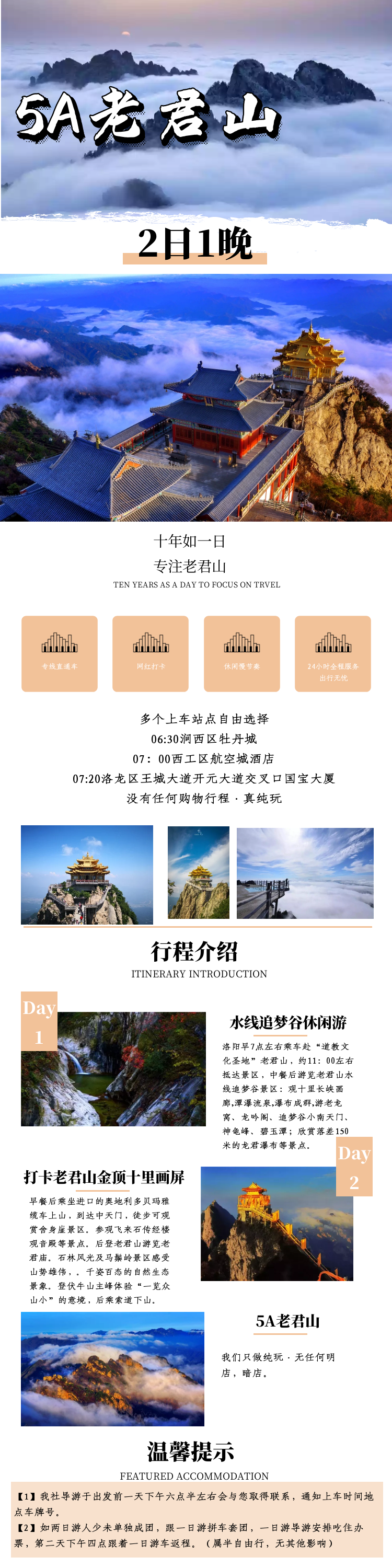 老君山:古名景室山,因道教始祖老子归隐修炼于此而更名。唐太宗李世民认老子为祖,颁御旨监修老君庙,封“铁顶”老君山为“天下名山”,与湖北武当山“金顶”南北呼应。八百里伏牛主峰老君山,海拔2200米,是国家级自然保护区,山水景点七十二处,其石林奇景被世界地质公园评审专家赵逊先生称是“迄今为止世界范围内发现规模大的花岗岩峰林奇观”。 鸡冠洞景区:鸡冠洞风景区位于河南洛阳栾川县城西三公里处,属天然石灰岩溶洞,地质学称其为“喀斯特岩溶地貌”。八大景区依次命名为玉柱潭、溢彩殿、叠帏宫、洞天河、聚仙宫、瑶池宫、藏秀阁、石林坊。 老君山峰林仙境、十里画屏为主题,东区寨沟、西区追梦谷为两翼的七大游览区。是旅游观光、朝圣祈福、休闲度假、科考探险、动植物观赏的最佳目的地。 是栾川目前唯一一家以喀斯特岩溶地貌景观为特色的旅游景区,形成于8亿年前,现已开发洞长1800米,上下分五层,洞内四季恒温18℃,清爽宜人,四季成游!