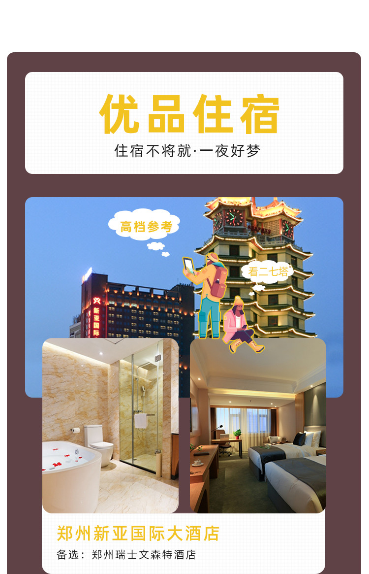 根据约定时间地点准时集合,乘车返回集合地(散团时间约18:00左右),如有赶车或其它有时间限制的活动安排,请下单前咨询客服哟!! 注:郑州散团地点为二七广场附近