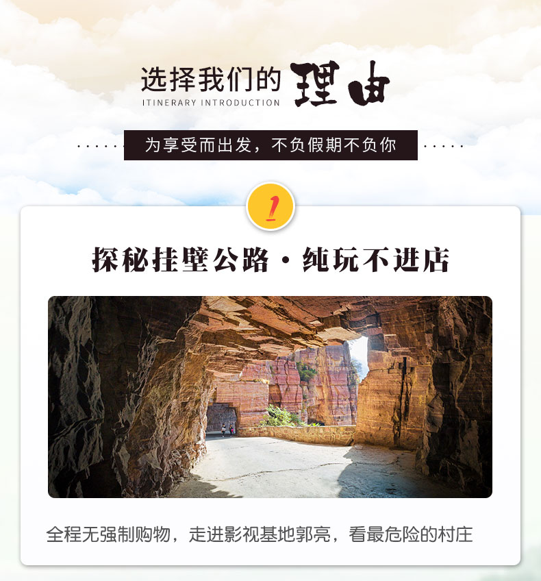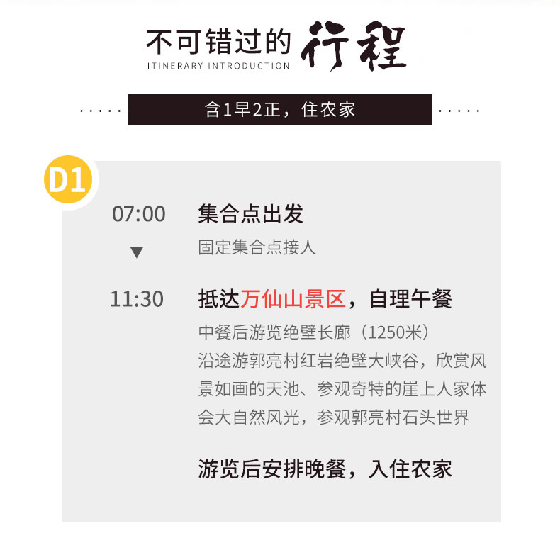 10:00左右,抵达后农家用中餐,之后换乘景交车(景区小交通45元/人) 11:00换乘景交车游览绝壁长廊,游红岩绝壁长廊,绝壁长廊,全长1250 米,是一个山间遂道 17:00左右,安排入住后用晚餐