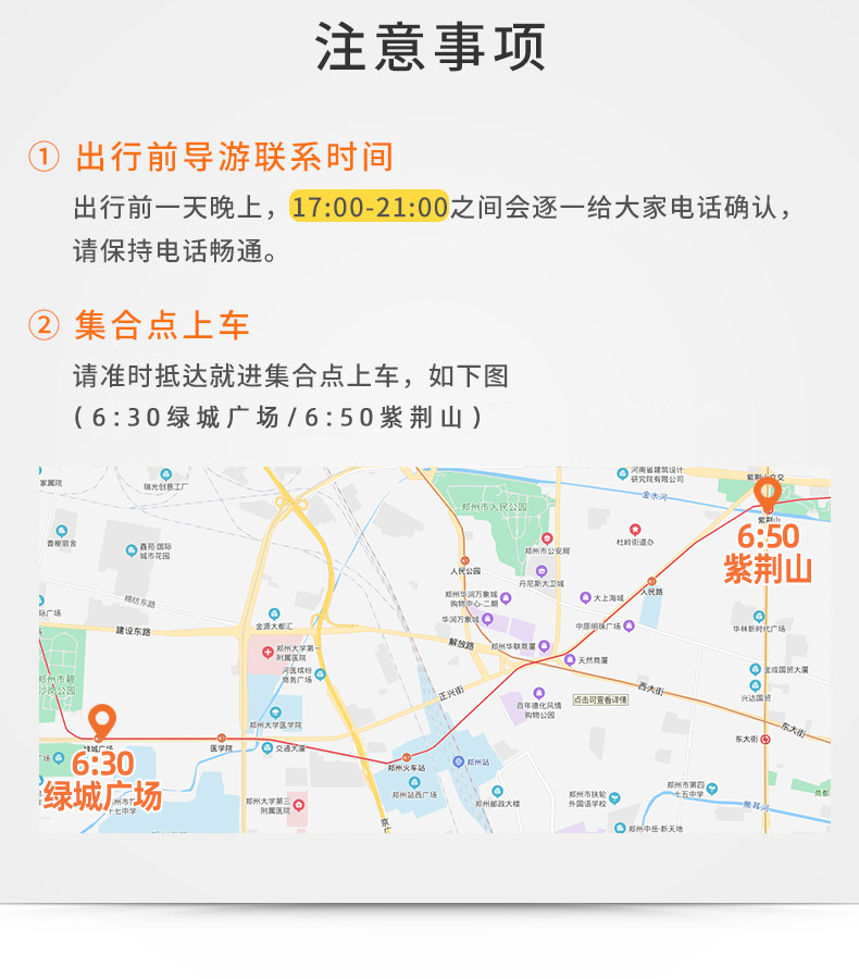14:30左右集合返回 19:30左右抵达郑州,郑州火车站客人返程顺路下车/集合点散团(旺季特殊情况,不保证客人回郑州时间,如有赶火车或者飞机,请提前告知!行程时间仅供参考,以当天路况和导游安排为准)