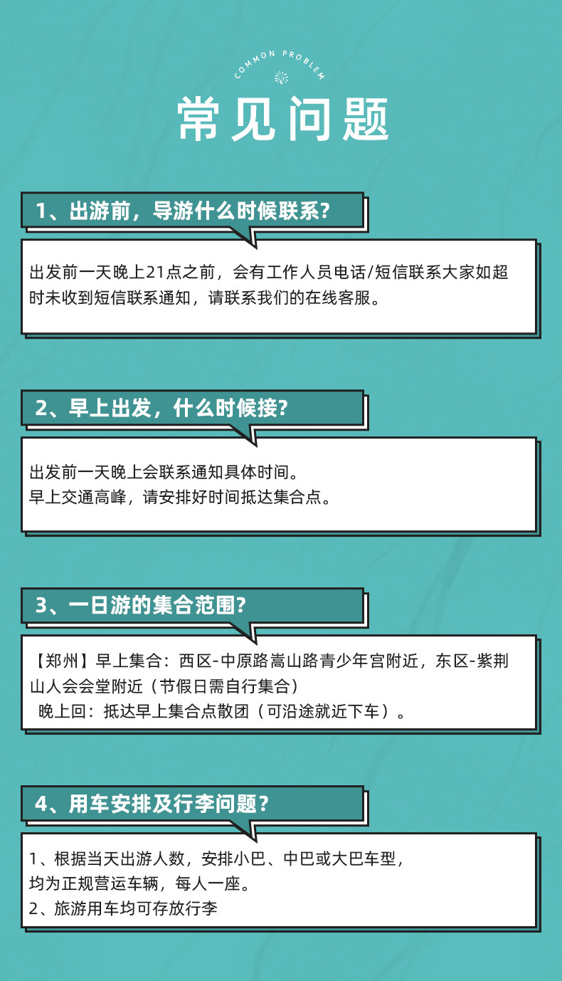| 出发城市 | 郑州 | 交通方式 | 汽车去汽车回 | 发团日期 | 天天发团 | 参团性质 | 常规团 |