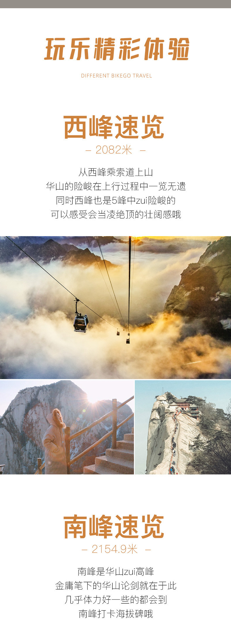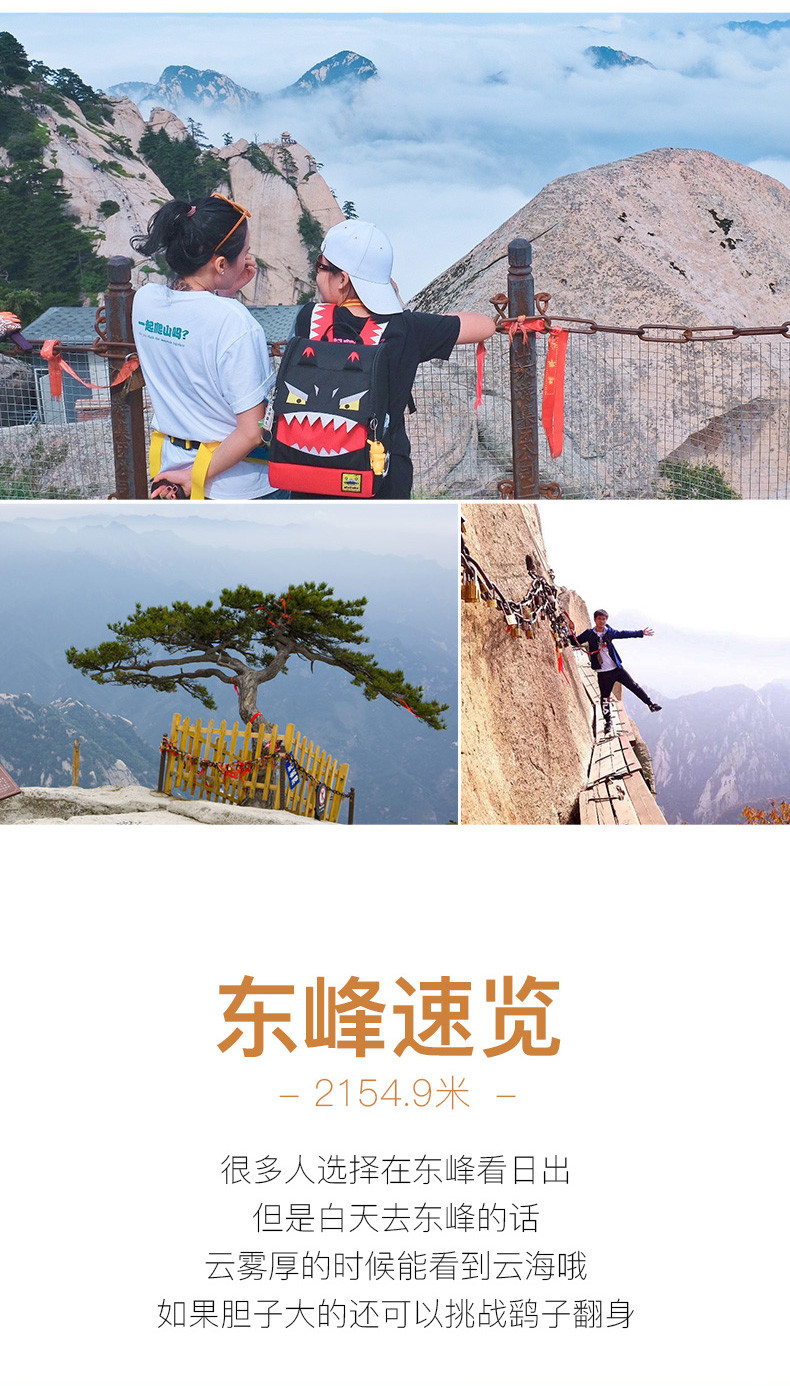 夜爬不需要进山太早,山上气温低很冷。控制好慢爬即可,务必带好防寒加厚衣服,次日东峰观日出,逆时针游览南峰、西峰、索道下山,西峰索道是华山景区必体验项目之一,一定要去,超级刺激,治疗恐高、