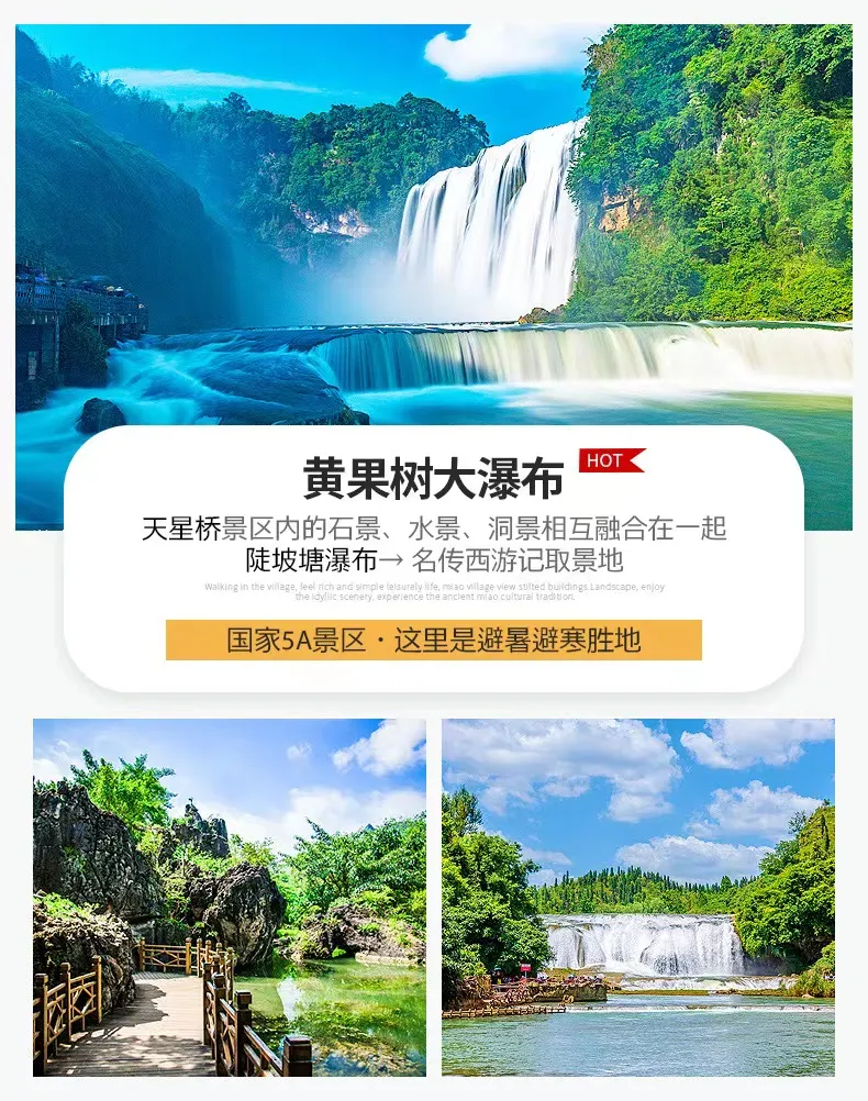 D1 出发地>>>贵阳用餐:— | — | — 住宿:贵阳 各地乘坐高铁/飞机抵达贵州省会—贵阳。 抵达后,专车送抵酒店。 安排入住后可自由活动,自由活动期间,请注意人身财产安全。 自由活动期间,贵阳市内特别推荐:【青云市集】,独家赠送<青云市集专享套餐优惠券>。 青云市集位于南明区青云路,素有贵阳“深夜食堂“之称,是贵阳市民和游客必逛的美食街区,浓厚的烟火气让这里形成了独特的美食文化。 到了贵阳,一定要去青云市集,美美地感受夜色市井生活下独有浪漫,尽享着这里的不一样的潮玩体验,品尝“老贵阳味道”,沉浸式体验贵阳特色新玩法。 地址:贵州省贵阳市南明区青云路83号 营业时间:11:00—凌晨4:00 D2 贵阳—荔波小七孔景区—西江/凯里用餐:早√ | 中√ | 晚√ 住宿:西江/凯里 早餐后,乘车前往世界自然遗产——【荔波小七孔景区】,行车时间约4小时左右。 抵达后游览【荔波小七孔景区】(不含电瓶车及保险50元/人,必要消费;不含鸳鸯湖游船费30元/人,自愿消费,费用敬请自理),景区全长7千米,因响水河上横跨着一座青石砌成的七孔拱桥,“小七孔风景区”因此得名。主要有小七孔古桥、拉雅瀑布、68级跌水瀑布、石上森林、水上森林、卧龙潭、鸳鸯湖等21个景点。 后前往游览黔东南苗族之乡—【西江千户苗寨景区】(不含4程电瓶车20元/人,不含保险10元/人,必要消费,费用敬请自理),行车时间约3小时左右。 西江千户苗寨全国大的苗族村寨, 千户苗寨四面环山,重峦叠嶂,梯田依山顺势直连云天,白水河穿寨而过,将西江苗寨一分为二。寨内吊脚楼层层叠叠顺山势而建,又连绵成片,房前屋后有翠竹点缀。誉有 “苗族露天博物馆”之称。 晚餐后入住酒店休息或自由活动。 D3 西江—丹寨—卡拉村下午茶—安顺用餐:早√ | 中√ | — 住宿:安顺/平坝 早上伴随鸡叫虫鸣声起床,欣赏美丽的晨景,云烟缭绕,又是另一番景象,走进苗家人的生活走街蹿巷。 酒店用早餐后乘车前往非遗小镇【丹寨小镇】(行车时间约1.5小时左右),小镇以非物质文化遗产、苗族、侗族文化为内核,融商业、文化、休闲、旅游为一体。走进非遗小镇,自由参观苗族非遗工艺介绍、蜡染、银器作品鉴赏,去感知民族匠人精神。 之后前往中国鸟笼之乡,国家森林乡村【卡拉村】,卡拉村位于贵州省丹寨县城东北部,距县城3公里,该村是丹寨县芒筒筒芦笙的发源地之一,具有浓郁的民族风情和深厚的民族文化底蕴;手工鸟笼工艺是该村特色。也是卡拉村主要经济收入来源之一。 品牌VIP专属卡拉村下午茶 漫步国家森林村落,和民族手工艺人一起制作鸟笼、蜡染(蜡染/编鸟笼二选一);或在原始的吊脚楼上,在原生态的民族歌声中,捧起古朴茶盏,品味午后原始村落的神韵。 游览结束后前往安顺入住,行车时间约3小时左右。 中餐安排:【苗家盛宴】 D4 酒店—综合商场—黄果树景区—安顺/贵阳 用餐:早√ | 中√ | — 住宿:安顺/贵阳 早餐后,乘车前往【综合商场】(参观时间2小时)。 午餐后乘车前往国家 AAAAA【黄果树风景名胜区】(不含景区环保车和保险60元/人,必要消费;不含景区大扶梯单程30元/人,往返50元/人,自愿消费,费用敬请自理),行车时间约 2 小时左右。 黄果树风景名胜区由【天星桥景区】、【陡坡塘瀑布景区】和【黄果树大瀑布景区】组成。 到达景区后乘坐景区环保车进入景区,参观亚洲第一大瀑布【黄果树大瀑布】(游览约2小时)它高77.8米,宽101米,是瀑布群中最为壮观的瀑布,也是一个唯一有水帘洞自然贯通的瀑布,观盆景园、水帘洞,游“风刀水剑刻就的万顷盆景、根笔藤墨绘就的千古绝画”且能从洞内外听、观、摸的瀑布, 游览后,搭乘景区环保车前往【天星桥景区】(游览约1小时)这里的石、树、水的美妙结合,是水上石林变化而成的天然盆景景区。 然后游览《西游记》拍摄地【陡坡塘瀑布】(游览约半小时)它位于黄果树瀑布上游1公里处,它是黄果树瀑布群中瀑顶最宽的瀑布。陡坡塘瀑布有一个特设的现象,每当洪水到来之前,瀑布都会发出轰隆的吼声,因此又叫吼瀑。 游览完毕入住安顺/贵阳,行车时间约2小时左右。 中餐安排:【布依家常菜】 D5 酒店—天河潭(外景)—送站用餐:早√ | — | — 住宿:无 早餐后乘车前往贵州山水浓缩盆景、喀斯特岩溶景观精髓——【天河潭景区】外景(该景区为产品特别赠送,含门票,不含电瓶车30元/人,必要消费,费用自理,如自动放弃游览,均无退费),行车时间约2小时左右。 天河潭景区内,拥有国内最宽的钙化滩—卧龙滩钙化瀑布,穿天生桥,游览喀斯特地貌代表作水洞、旱洞。 观景台很清幽,路比较窄,宽度约一米,深受大家的喜爱,若恋人想要经过便要携手依偎而行,就像在爱情的道路上,也需要相互扶持、相互依靠直到白头偕老一样。竹林深邃和静谧将在内心的深处种下一棵温馨的种子,像竹子一般圣洁、高雅, 观景台是纵览天河潭核心景区美景的最佳观赏点,凭高而望,山下卧龙飞瀑、水上梯田、欢乐草坪、石蚌滩瀑布、天生石桥等美景可尽收眼底,让人深感“会当凌绝顶,一览纵山小”的豪壮与舒远。 航班时间需订在16:00以后 ;高铁15:00以后(最后一天赠送景点天河潭,不去费用不退)。 参加5天行程的贵宾第五天行程结束统一送站 参加6天行程的贵宾第五天行程结束后,随大巴车送站结束后送到酒店自由活动,第6天根据航时间送站