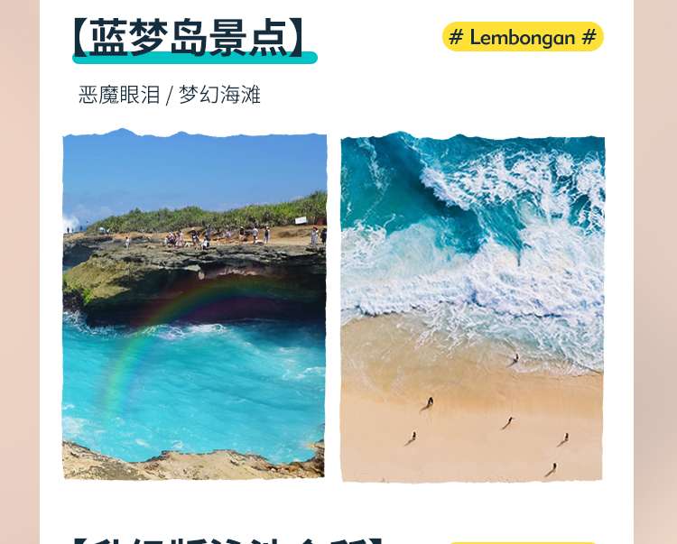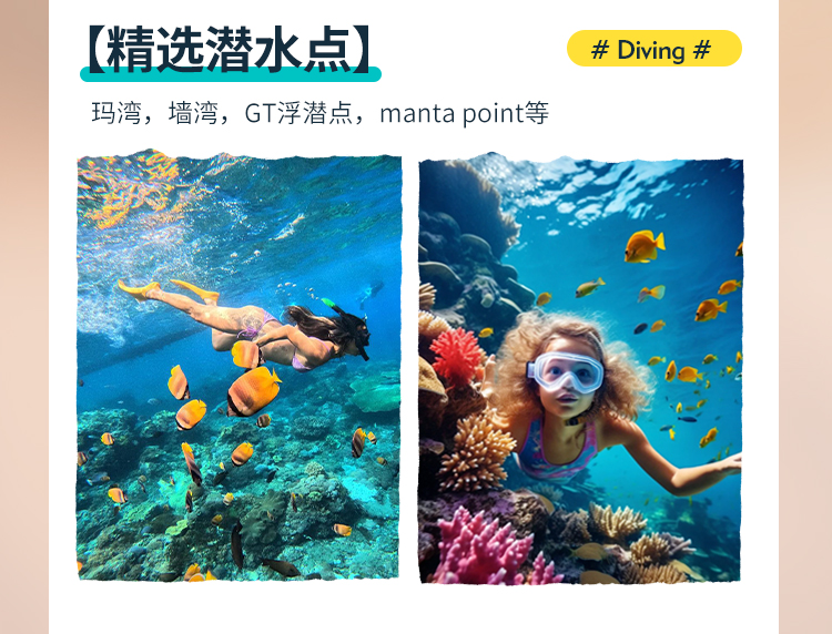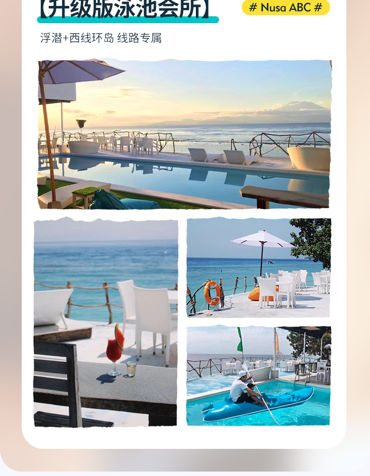 | 第五天:畅游出海,任你选择---金巴兰海滩 出海套餐2选1: 套餐1: 蓝梦岛+贝尼达岛双岛出海【包含:佩妮达岛:海上浮潜+ 独木舟+海景泳池;蓝梦岛环岛游:恶魔眼泪+梦幻沙滩+黄色爱之桥 】 【蓝梦岛】是位于巴厘岛东南边的一个离岛,比巴厘岛本岛更安静,仿佛身在马尔代夫一般。这里的海水清澈无比,非常适合潜水,水下生物清晰可见,因此也被称为“玻璃海”。 【恶魔的眼泪】蓝梦岛著名景点之一,实际是一个小的悬崖,因为常年的海水冲刷,形成了一个开口圆形的形状。悬崖底端有被海水冲刷出的洞穴,因为压强的挤压,涨潮的时候海浪在这里被冲出二三十米高。在阳光照射时,水雾中会形成彩虹,海水平静时和涨潮时的对比是看点,不禁让人感叹大自然带来的震撼。周围是由坑坑洼洼的礁石构成的,就像一滴滴眼泪,非常符合这个名字,很值得一游。(此处景点浪大,一定注意安全,远观即可,切勿靠近) 【贝达尼岛(浮潜+独木舟)】让我们前往巴厘岛最美最纯净的贝尼达岛,滑行于湛蓝色的海面上,窗外不断快速掠过的景物,带走您一切烦心俗事,体验一下不同的巴厘岛风情,从地图上看,贝尼达岛比蓝梦岛大10倍,但这里却是一个未开发无污染的原始海岛!岛上种满了椰子树,海水清澈无比,水下的海苔和珊瑚群清晰可见。那些绝美而不为人所知的景点,值得你特意前往! 我们可以在水上平台体验浮潜,与海底生物亲密接触,也可悠闲的乘坐单人独木舟享受玻璃海的清澈美丽,还可自费参与更多刺激的水上项目(海底漫步,摩托艇等)。之后前往贝尼达岛本岛用餐。 【金银岛黄色爱之桥】乘车前往金银岛黄色爱之桥,拍照打卡! 套餐2:佩妮达岛出海【包含:海上浮潜+独木舟+俱乐部泳池+三个网红点打卡Broken Beach 破碎沙滩+Angels Billabong 天神浴池+Kelingking Beach 恐龙湾】 【贝达尼岛 (浮潜+独木舟+泳池) 】 在这里,你可以参加浮潜、看五彩斑斓的鱼儿在眼皮底下游走;你也可以坐上独木舟,慢慢在大 海滑行,在岛屿之间穿梭,流连于美景之中。玩累了靠在沙滩椅上,悠闲地翻几页书,发个呆, 打个盹儿,有连绵的海浪声依稀相伴,好不惬意。你也可以悠闲的在泳池里面游泳,观海听涛!在这风景如画的海上乐园,让我们玩尽疯狂刺激的海上活 动,让我们换个方式,体验真正的海岛乐趣! - 独木舟(精彩刺激嗨翻天~~) - 浮潜(提供浮潜用具:救生衣、蛙镜、呼吸管) - 海边俱乐部 游泳池、沙滩椅、免费毛巾 - 岛上中餐自助餐、清凉饮料 【Broken Beach 破碎沙滩】是经过海水冲击天然形成的特殊景色,有很大几率可以在宝蓝色的海水里看到魔鬼鱼噢 【Angels Billabong 天神浴池】这是一个天然形成的火山岩无边泳池,藏在一块火山岩背后,海浪的日积月累,终于将此侵蚀成 一个独特的岩内浴池景观,池外是广阔浩瀚的大海,非常壮观。 【Kelingking Beach 精灵坠崖】这座海上风景和《太阳的后裔》里的希腊沉船湾如出一辙,翠绿的山崖岛上延伸至海 里,形状看 起来像一只可爱小恐龙的脊背,又名恐龙湾。仿佛魔法世界才会出现的景象,因此被许多人誉为 一生中 必去的地方。 傍晚前往欣赏世界最美的十大落日之一的【金巴兰海滩落日】(停留约 1-1.5 小时),世界最美的十大落日美景之一金巴 兰海滩,海景落日、 沙滩、歌手民谣、美食、点点烛光,无限浪漫。把巴厘岛旅游带入一个新的境界。 | |||