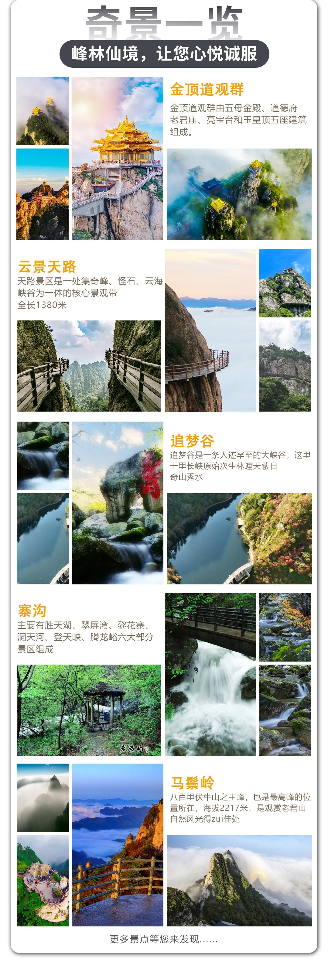 行程概览: 08:40-9:40 市区范围内酒店可以接。 9:40-11:50 乘车前往世界地质公园、国家AAAAA级旅游景区——老君山,抵达景区售票处后,统一办理入园手续。 11:50-19:30乘坐一段索道上山。参观老君山景区,中天门、飞来石、传经楼、老君庙、十里画屏、金顶道观群,感受伏牛山第一峰气势雄伟,云海红叶、群峰竞争、千姿百态的自然生态现象。体验‘一览众山小’的意境,后乘坐索道下山集合。 19:30-22:30乘车返回洛阳市区,结束愉快的行程。 【行程仅供参考 具体时间以导游安排为准】 如遇五一假期、十一假期、暑期、牡丹花会期间:不保证返程时间,如有赶火车/高铁/飞机等返程票的客人,烦请注意!! 费用包含 门票:景点首道大门票 小交通:第一段中灵/云景索道 车费:往返空调旅游巴士 导游:优秀导游服务 保险:旅行社责任险(赠送旅游意外险) 费用不含 1.不含老君山峰林索道 2.全程不含餐,建议自带零食补充能量 3.不含其他个人消费。 08:40 丽景门地铁C出口 09:00 洛阳火车站7天酒店 09:10 解放路地铁站A出口(丹尼斯大卫天地) 09:40 高铁站妇幼保健院北门 备注∶具体集合地点、时间以导游通知为主。 注意事项 1.未成年人及老人出游,需家人陪同。 2.若在出发前一天下午临时取消行程,需赔偿旅行社车位损失费用以及已产生的费用。 3.导游将在出发前一天晚17:00-22:00左右电话或短信联系客人,如22:30之后没有取得联系,请及时联系工作人员。节假日会适当延迟,敬请您的谅解。 4.请客人按照要求在规定时间抵达指定地点,先来后到不排座位。 5.若因不可抗力造成的行程延误(如:道路拥堵、旺季人多、自然灾害等)及非旅行社原因给游客造成的经济损失我社不予赔偿。 6.请关注天气,携带防雨防晒物品。 7.散客拼团,请各位游客相互尊重,并尊重司乘人员。 温馨提醒 1.请将客人身份信息发与我们以便实名预约景区门票。 2.出行当天需携带本人有效身份证方便景区核验入园。 老君山一日游(20人精品小团) VIP精品小团
