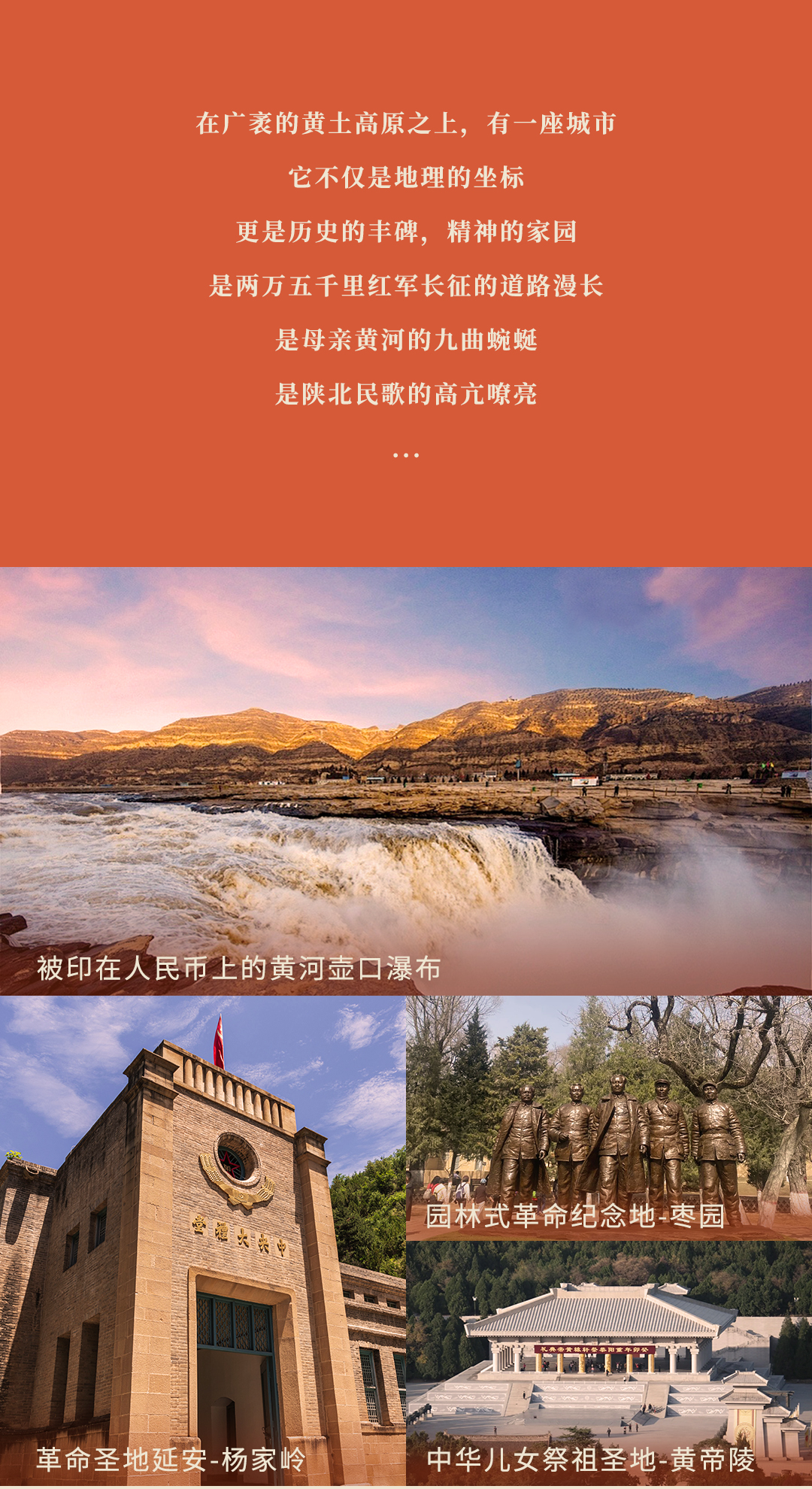 “陕北延安是中国革命的圣地,老一辈革命家和老一代共产党人在延安时期培育形成的延安精神是我们党的宝贵精神财富”。延安是中华民族始祖黄帝陵寝黄帝陵所在地,是民族圣地、中国革命圣地,国务院首批公布的国家历史文化名城。延安是中华民族重要的发祥地,人文始祖黄帝曾居住在这一带,是全国革命根据地城市中旧址保存规模最、大、数量最多、布局最为完整的城市,有“中国革命博物馆城”的美誉。