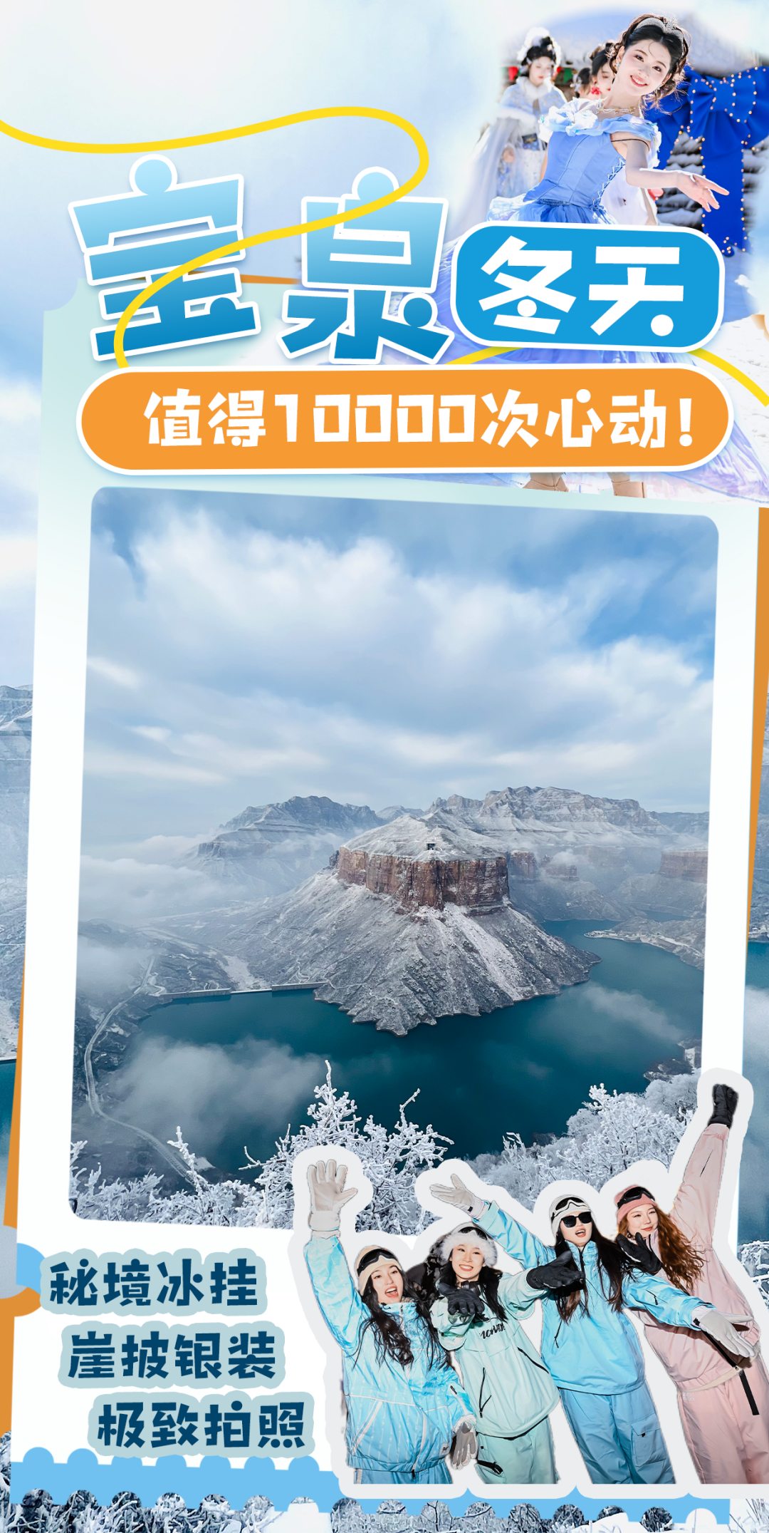 银装添峻岭 素裹映苍崖 雪花翩翩起舞与崖壁之间 冬日魔法不断上演 红崖焕新装 期待与你置身于银白世界 登崖壁赏雪景 尽享独属于宝泉冬日的浪漫~ 太行冰挂、铁锅温泉、花样冰雪... 极致冰雪打卡、泉新冰雪体验 期待我们一起在宝泉冬日相遇~ 祥云观景台位于园区中段,是在300多米的悬崖上建设的异型钢结构,单层面积突破了716平方米,是目前世界上最、大的玻璃底观景平台。以“天降祥瑞·行云流水”为设计创意,整体形态就像一片漂浮的七彩祥云,色彩万千,环绕在山间。上层平台外侧选用超白玻璃,通透纯粹,给人带来轻巧、刺激的视觉体验;内侧选用七彩云纹格栅,颜色丰富,给人带来极致的视觉冲击;下层挑战平台好似彩虹飘带,与上层平台相映衬,涵盖了山水观光、悬崖蹦极、云中漫步、高空滑道和步步惊心等多种体验项目。 有一种惊险来自悬崖之上,是河南首个建在悬崖上的过山车体验项目。 人生无限可能,蹦极姿势千百种,在宝泉给天空一个拥抱"崖"。 中国曲峡,荣登《中国国家地理》杂志封面 世界之大,新宝泉崖天下! 人生,总要有一次惊心动魄的旅行 蹦极、攀岩、云崖漫步... 宝泉崖天下,天下你最“崖” 早上指定集合乘车出发,前往新乡宝泉大峡谷景区(车程约2小时)。到达景区后坐景区观光车入园,去体验宝泉大峡谷山水相融,休闲度假的闲适。游览路线:【宝泉大峡谷——游龙半岛——巨石滩双龙瀑布---杏树坪】等,沿途参观绝壁天书图,神龟戏水等,观奇石走廊,巨石海岸至聚龙广场,参观之后继续向上走游览见龙大瀑布,观瀑亭,叠翠谷游览——招宝石,千叠瀑,荷花潭,招宝天尊,跃龙瀑,凌云栈道等景点。中餐自理,餐后乘坐洞穴电梯去体验崖天下的惊险刺激,达崖天下山顶,欣赏宝泉游龙湾大峡谷湖光山色,拾级而上,我们来到了宝泉崖乐园,内容包括文创中心、穿越太行、星空营地、郁金香儿童乐园、中心剧场等,游览结束后乘坐吉尼斯世界纪录其一当前世界最、大单体单层吊厢的往复式索道【洛伽寺索道】返回,之后返回郑州结束愉快的行程。
