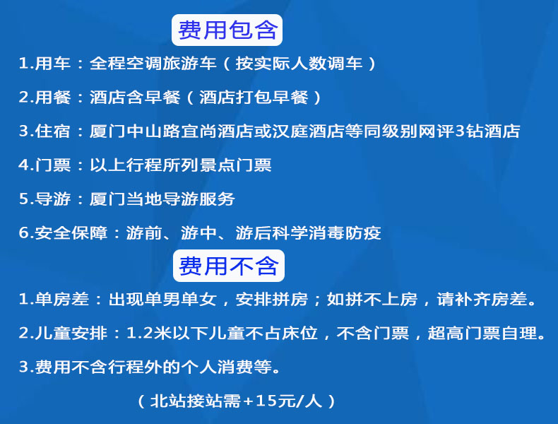 厦门机场或厦门站接站入住酒店。(温馨提示:如果厦门北站或接站超过23点,需增加费用15元/人)