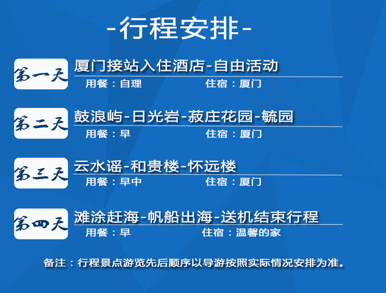 | 出发城市 | 厦门 | 交通方式 | 汽车去汽车回 | 发团日期 | 天天发团 | 参团性质 | 常规团 |