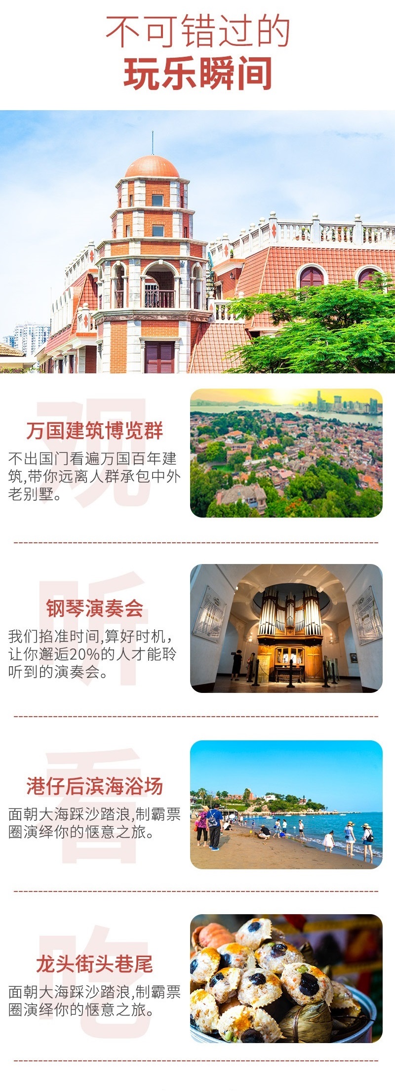16:40 【自由活动】鼓浪屿也是一个浪漫之地,随处都是美景美食,这里有网红小吃街,沈家肠粉的糯香四溢,林氏鱼丸的Q弹有劲等等,可以轻松漫步地尽情享用这里的美食、美景!