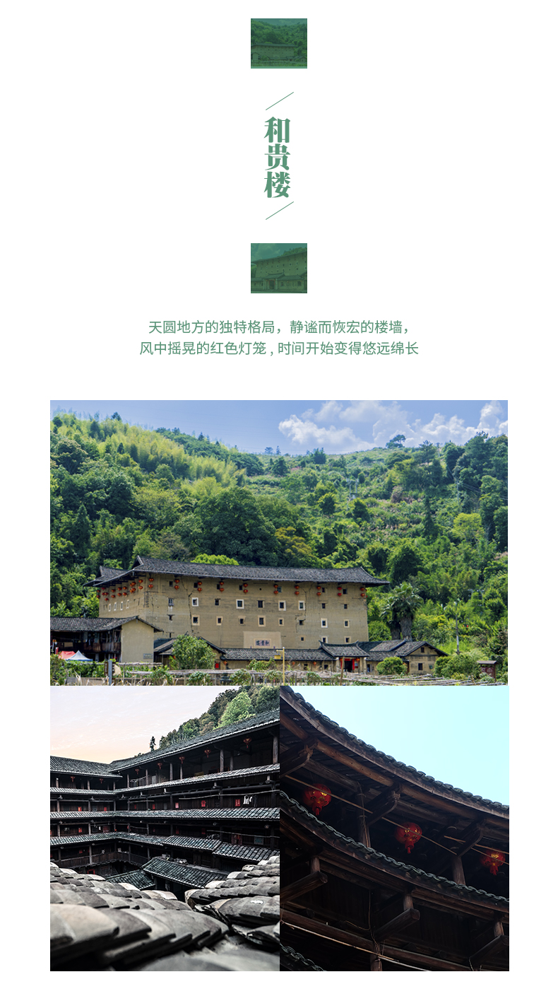 12:00 午餐后,第一站游览全国重点文物保护单位,福建土楼“世遗申报点之一”--【和贵楼】, 建于清代雍正十年,是座占地1547平方米,是南靖最高的土楼。这座土楼建在沼泽地上,用200多根松木打桩、铺垫,整座楼像一艘大船停泊在沼泽地上,虽历经200多年仍坚固稳定,巍然屹立,保存完好。