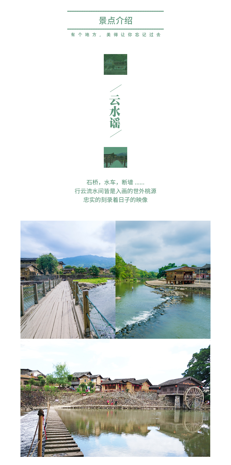 12:40 第二站步行游览【云水谣】古镇---云水谣古镇是个历史悠久的古老村落,此地风景秀美,古道沿溪而建,眼望是秀丽柔美的古榕树,此地也是电影《云水谣》《鲁冰花》《常常回家路》的拍摄基地,此景点我们停留约半小时游览观光!感受电影拍摄实景---感受千年云水谣带给我们的超然感觉。聆听云水谣传奇故事…